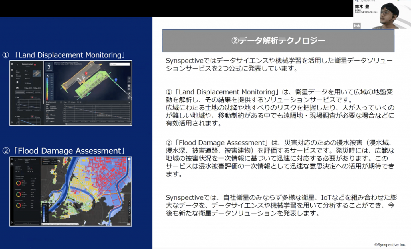 鈴木:ソリューションサービスとしては、現在「Land Displacement Monitoring」と「Flood Damage Assessment」の2つをリリースしています。前者では、地盤変動を可視化することで、広域にわたる土地の沈降や地すべりのリスクなどを把握可能です。これは、人の立ち入りが難しかったり、移動制約があったりする地域でも有効活用できます。後者は、主に浸水被害を評価するサービスです。例えば、豪雨で災害が発生したエリアであっても、位置情報にもとづいて被害状況を可視化できます。これは、保険業界などでも活用可能なサービスです。