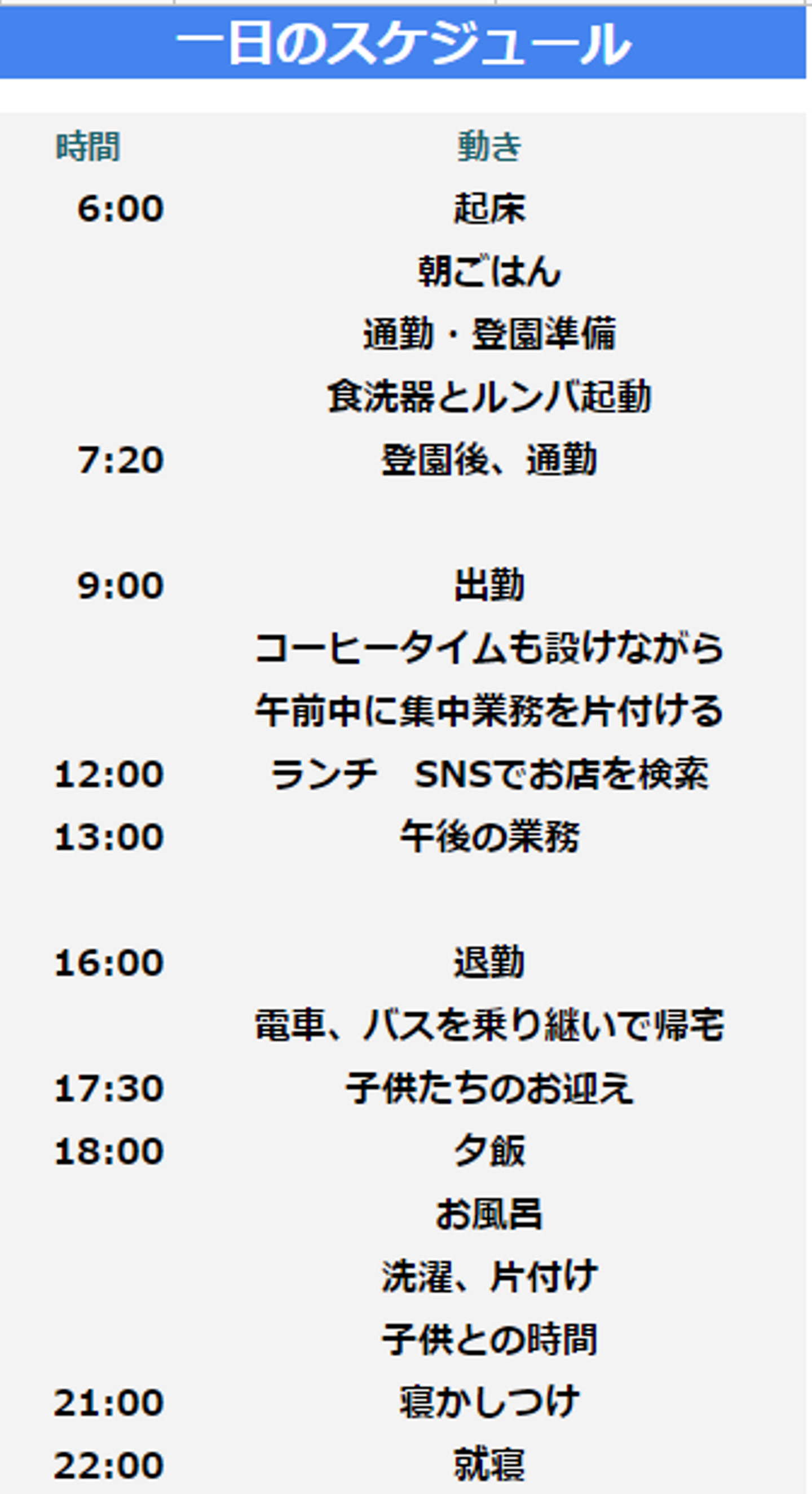 基本的に残業はほぼなく、このスケジュールどおりの毎日です。