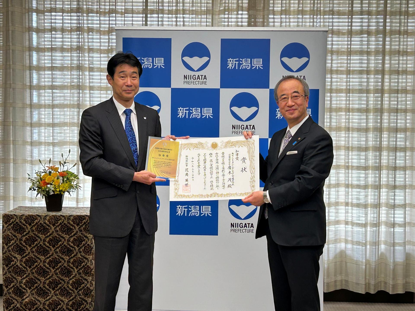 新潟県庁で行われた表彰式の様子(花角英世知事と)