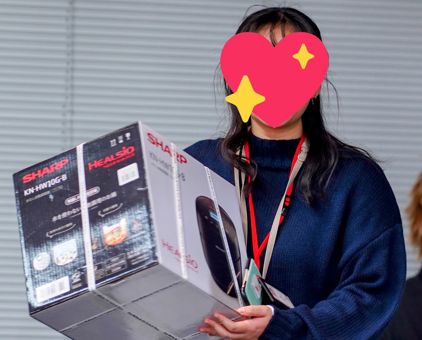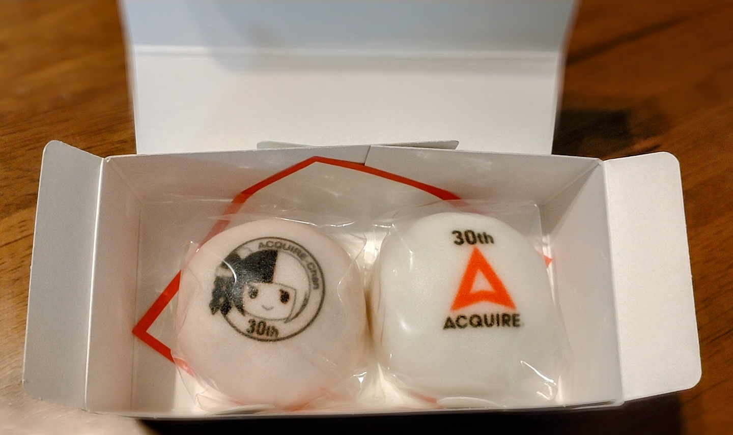 最後に従業員の皆様へ記念品が贈呈されました。記念品の内容は・・・弊社のロゴとアクワイアちゃんが印字された紅白饅頭、30周年の記念イラストが印字されたモバイルバッテリーでした!どちらも可愛い・・・🤤