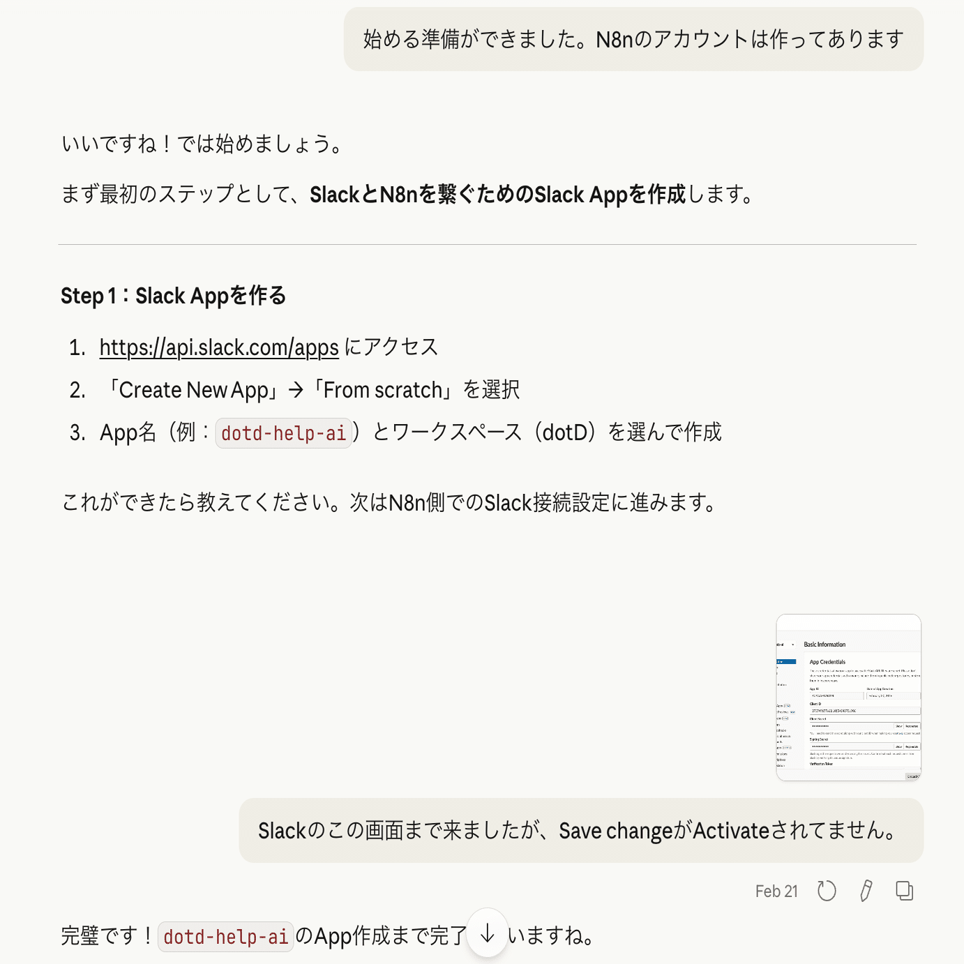 さらに、Slackのやり取りをただ格納するのではなく、AIが内容を要約・整理してからNotionに格納する「高度な自動学習機能」も実装したい。この辺りまでなら、「今のAIのサポートがあれば自分一人でもできそうだな」という手応えを感じています。