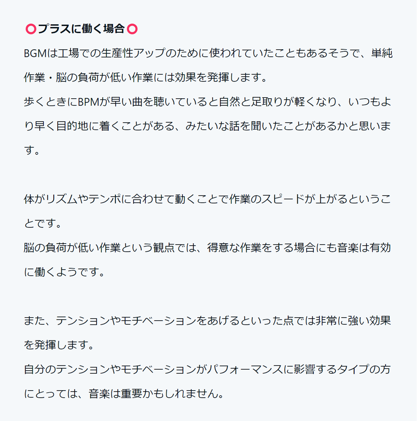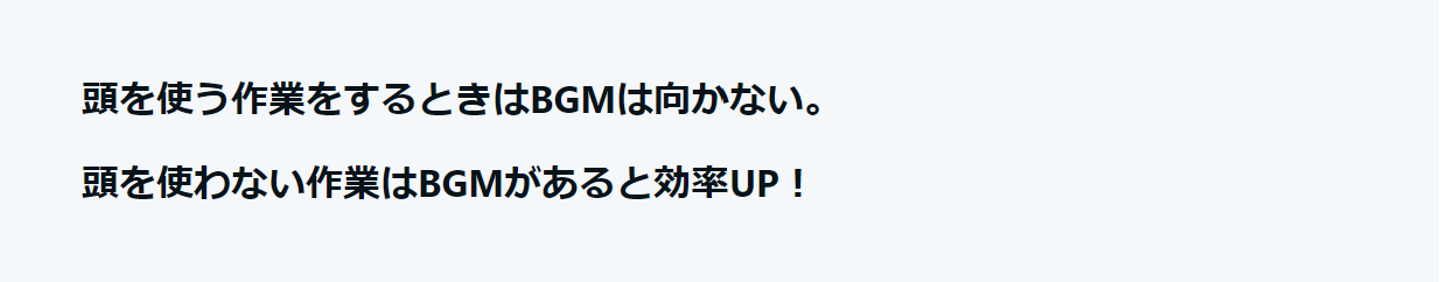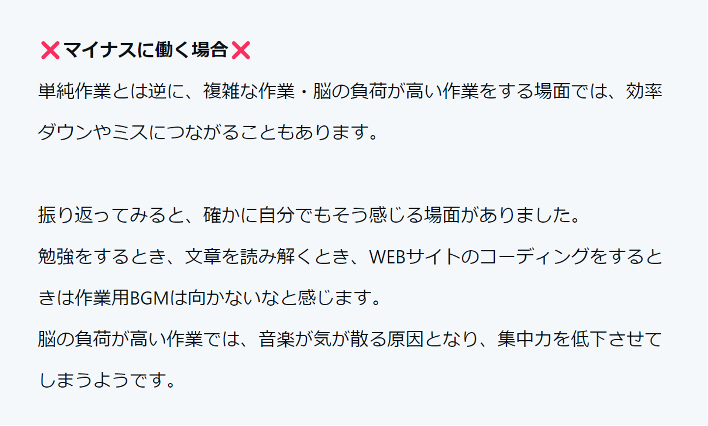 ã§ã¯âŠ ã»èªè§£èœåãšèšæ¶åã äœäžãã ã»éåèœå㯠åäžãã ã»å調ãªäœæ¥ãåŸæãªäœæ¥ãããå Žåã§ã¯BGMããã£ãæ¹ã ã¢ãããŒã·ã§ã³ããã³ã·ã§ã³ãäžããããšã§äœæ¥å¹çã¢ãã ãèŠèŸŒãã ã» ã«ãŒãã£ã³äœæ¥ ã«åããŠãã ã»éã«ã¯ãªãã€ãã£ããªäœæ¥ã§ã¯ çºæ³ãé»å®³ãããå¯èœæ§ ããã