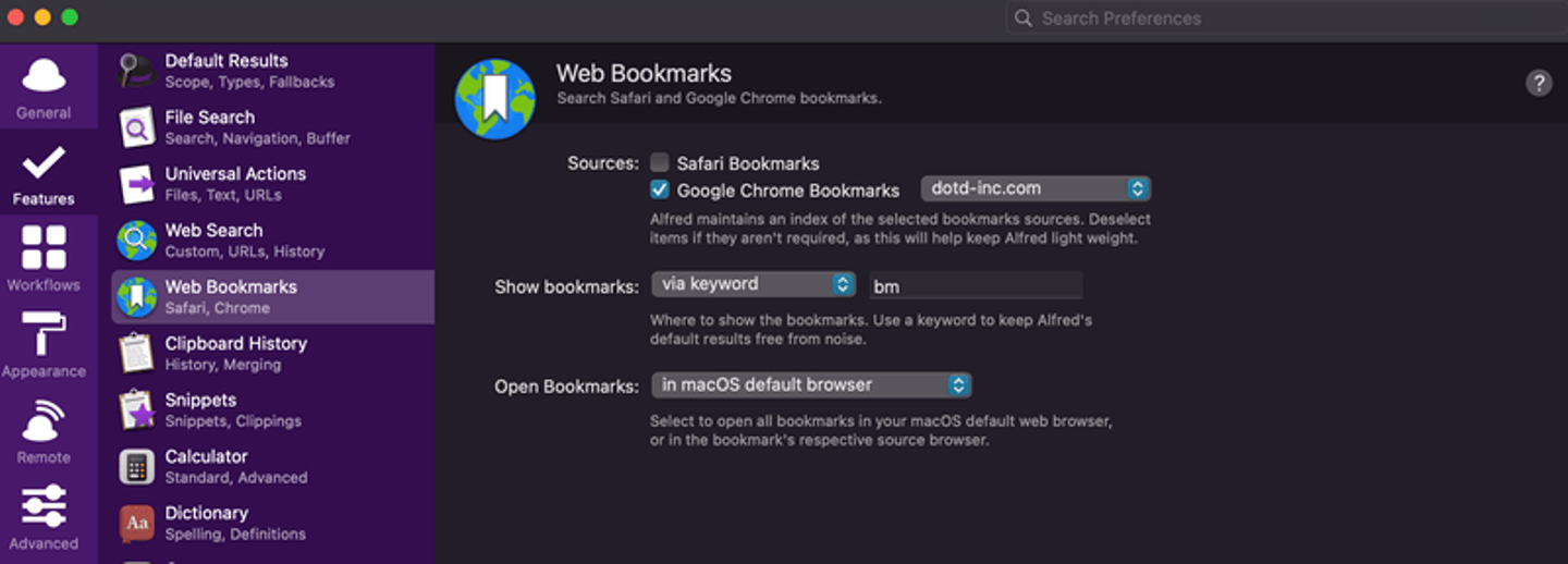設定で、ブラウザのブックマークのみから検索することもできます。
