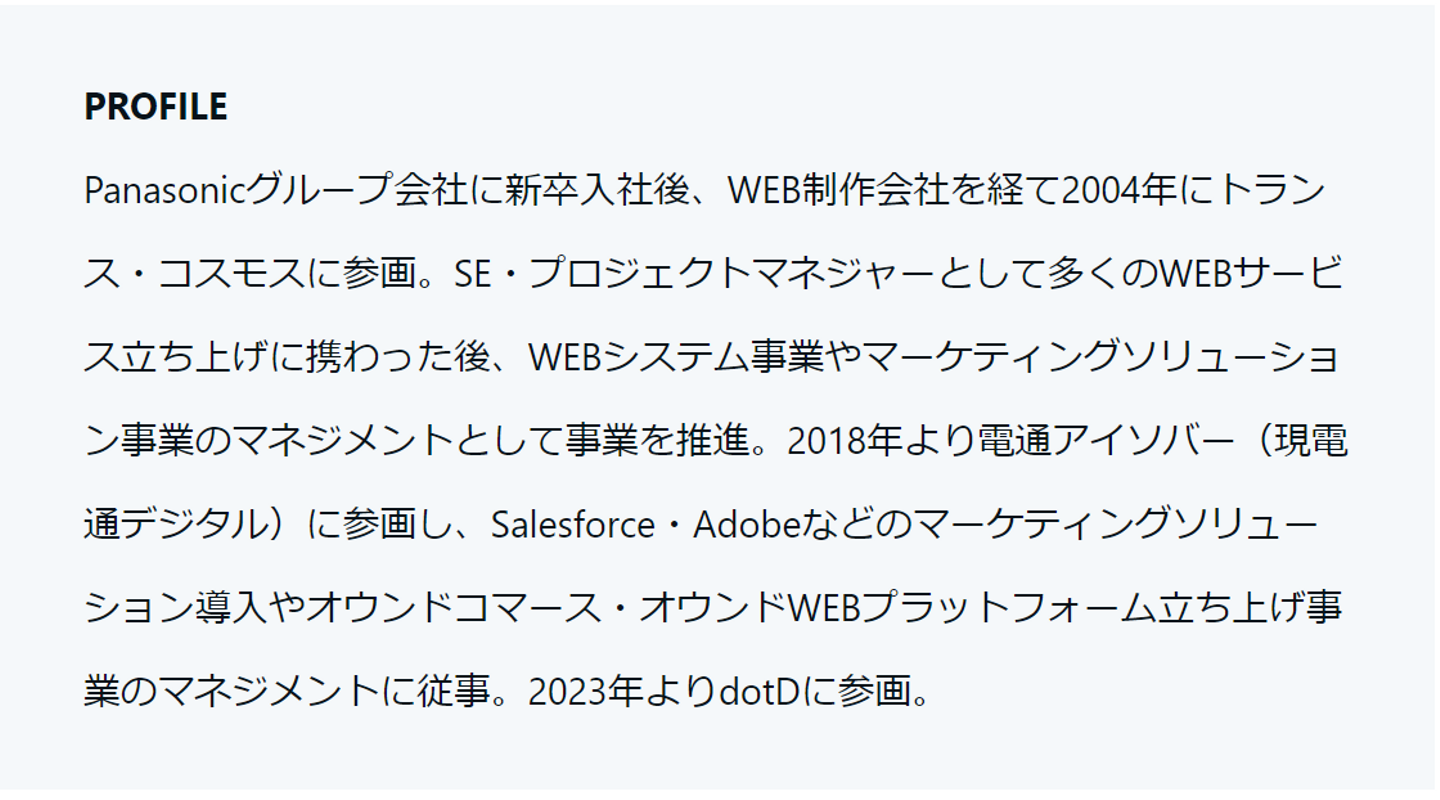 また、今まで自身で培ってきたデジタルマーケティングプラットフォームの知見を活かした案件や事業もどんどんやっていきたいと思っています。これまでお付き合いさせていただいた沢山の方々とまた一緒に大きなお仕事がしたいと思っていますので、ここまで読んでいただいたお知り合いの皆様、dotDにはいい人材が揃っていますので是非お気軽にお声がけくださいませ!