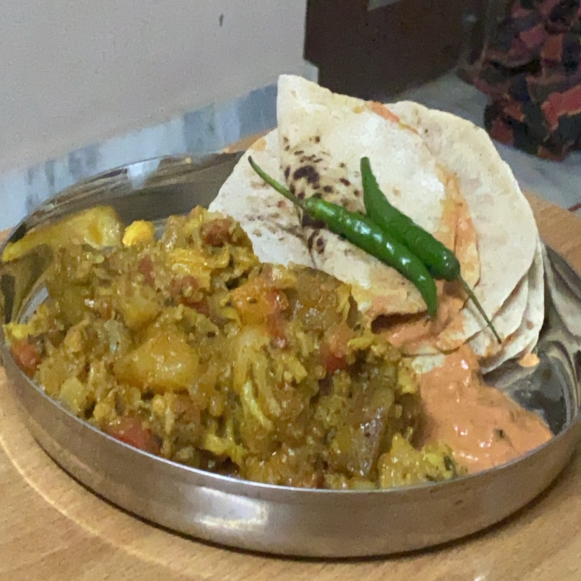 現地の方は、辛ーいサブジ(ウェットな野菜炒め)の上に青唐辛子!