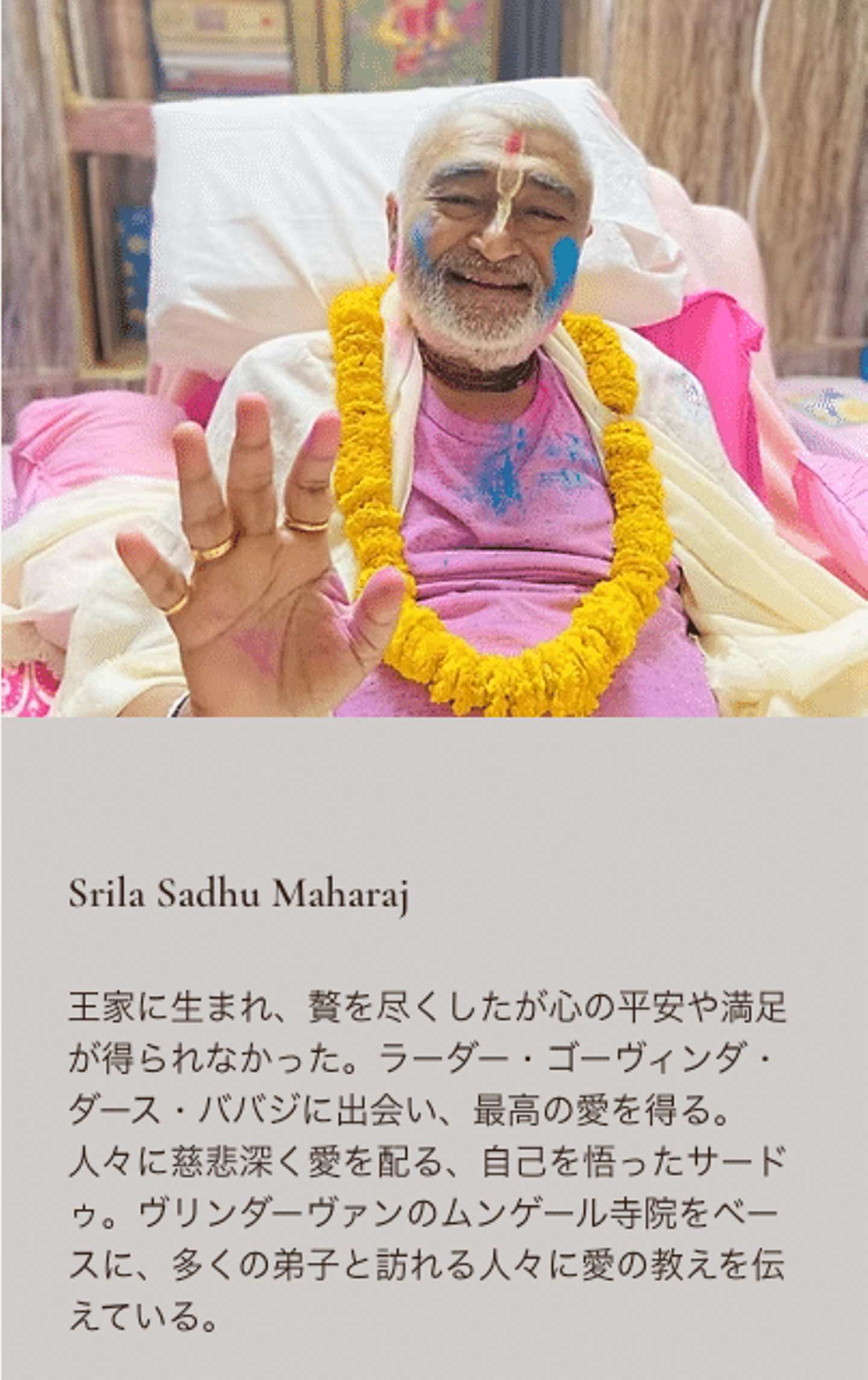 ヴリンダーヴァンには、ジャヤーナンダ師の師匠であるサードゥ・マハーラージャがいらっしゃいます。彼は自己を悟った聖者と言われ、国籍や宗教、性別など関係なく世界中の弟子たちを受け入れて、愛を配られています。