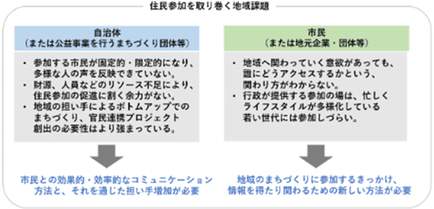 しかし実際には、 行政等が主催する市民参加の場への参加の少なさや、そこへ参加するメンバーの固定化などが全国的に課題となっています。