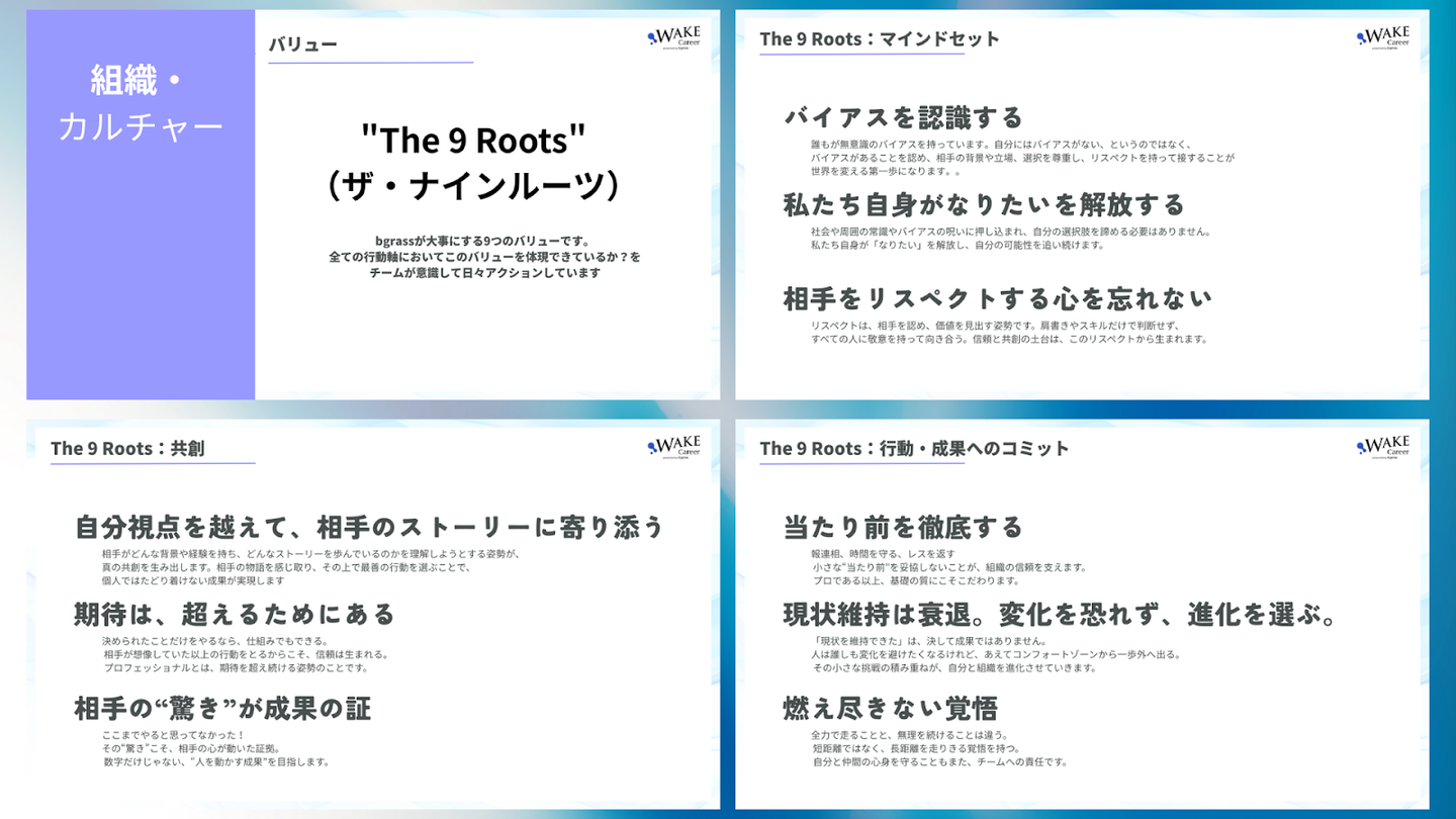 ※ "The 9 Roots”…bgrassが大事にする9つのバリュー。全ての行動軸において、このバリューを体現できているか?をチームが意識して日々アクションする。