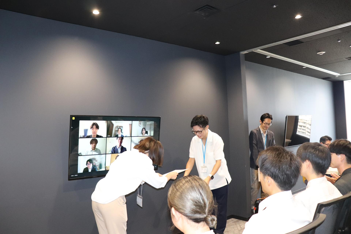 一人ひとり、弊社の代表奥秋から手渡しで内定証書の授与が行われ、内定者の方と固い握手を交わしました。内定者の方の力強い返事に、経営陣も「来年の4月が楽しみだ」と期待の言葉を述べていました。