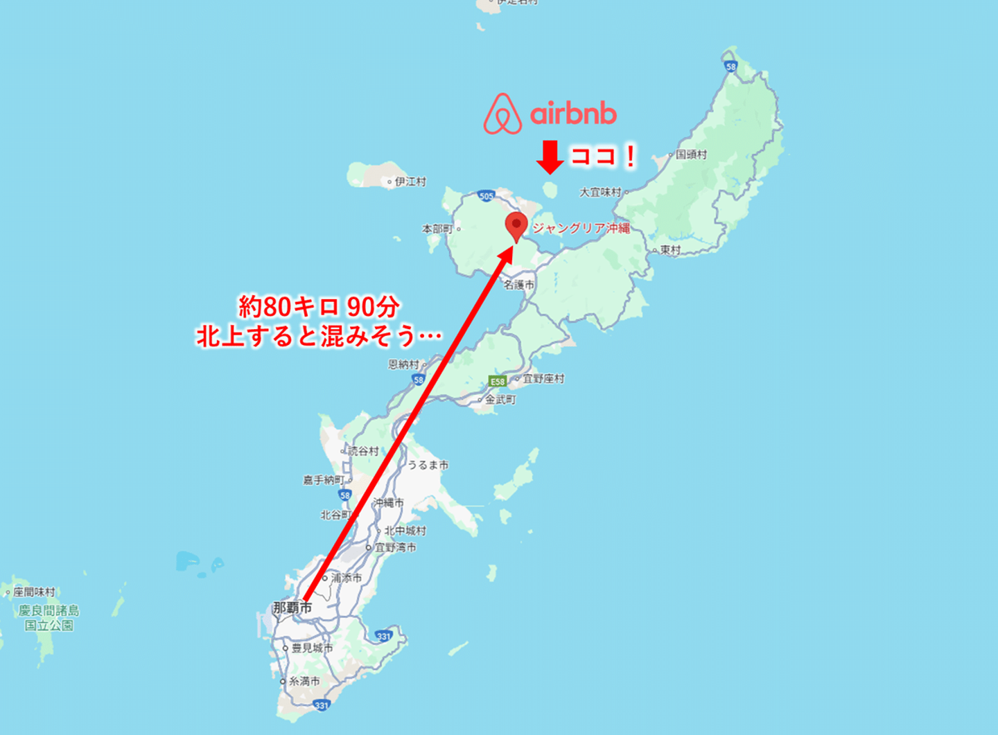 今回は、ジャングリアオープン当日は南部から北上する来場者が多いと見越して、あえて下ってジャングリアに向かえるよう古宇利島のヴィラを一棟借りしました。