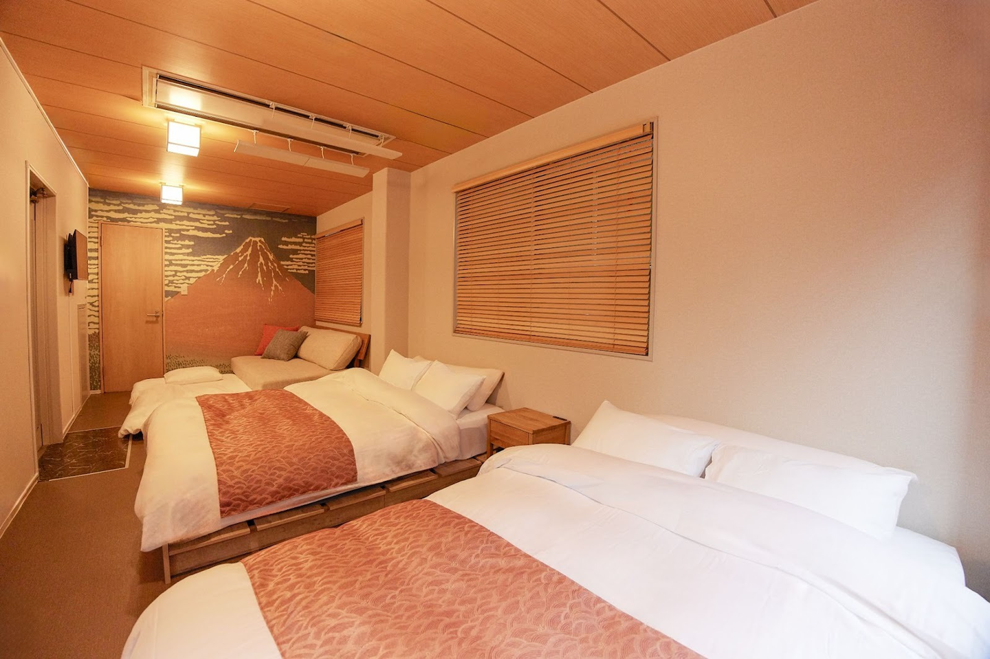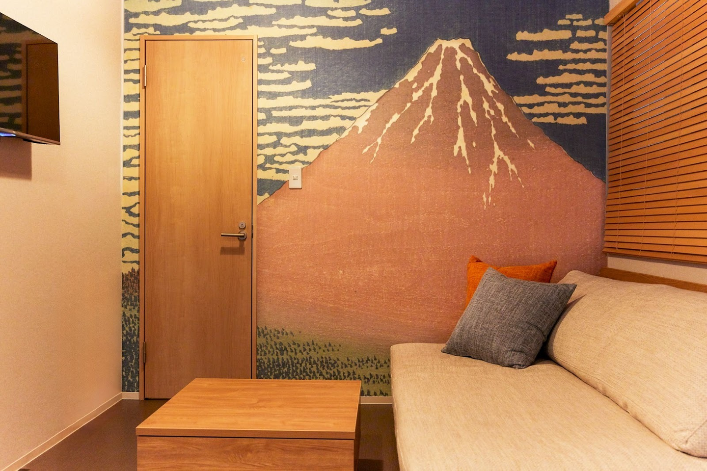 建物自体は和モダンを意識したデザインで、リビングや寝室も落ち着いた雰囲気。赤富士の壁紙を使った部屋もあり、日本を感じられる空間に仕上げています。実際に宿泊されるお客さまの9割は外国人で、その中でも中国とアメリカからの利用が半数を占めているんです。