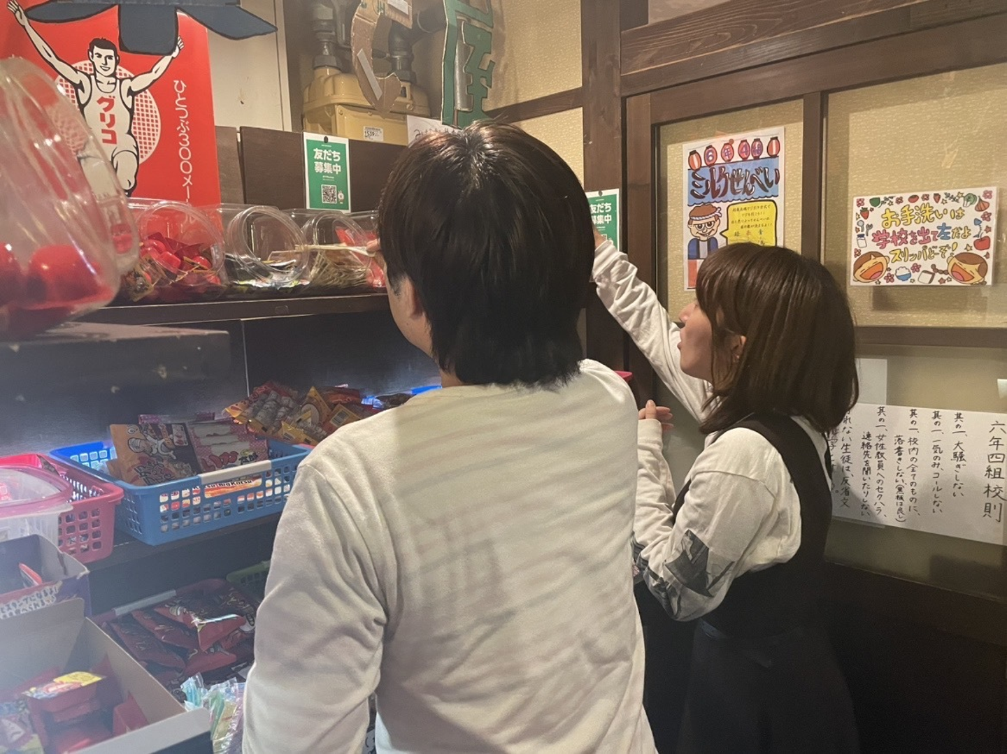 お店が駄菓子食べ放題だったのでお菓子を選ぶお二人