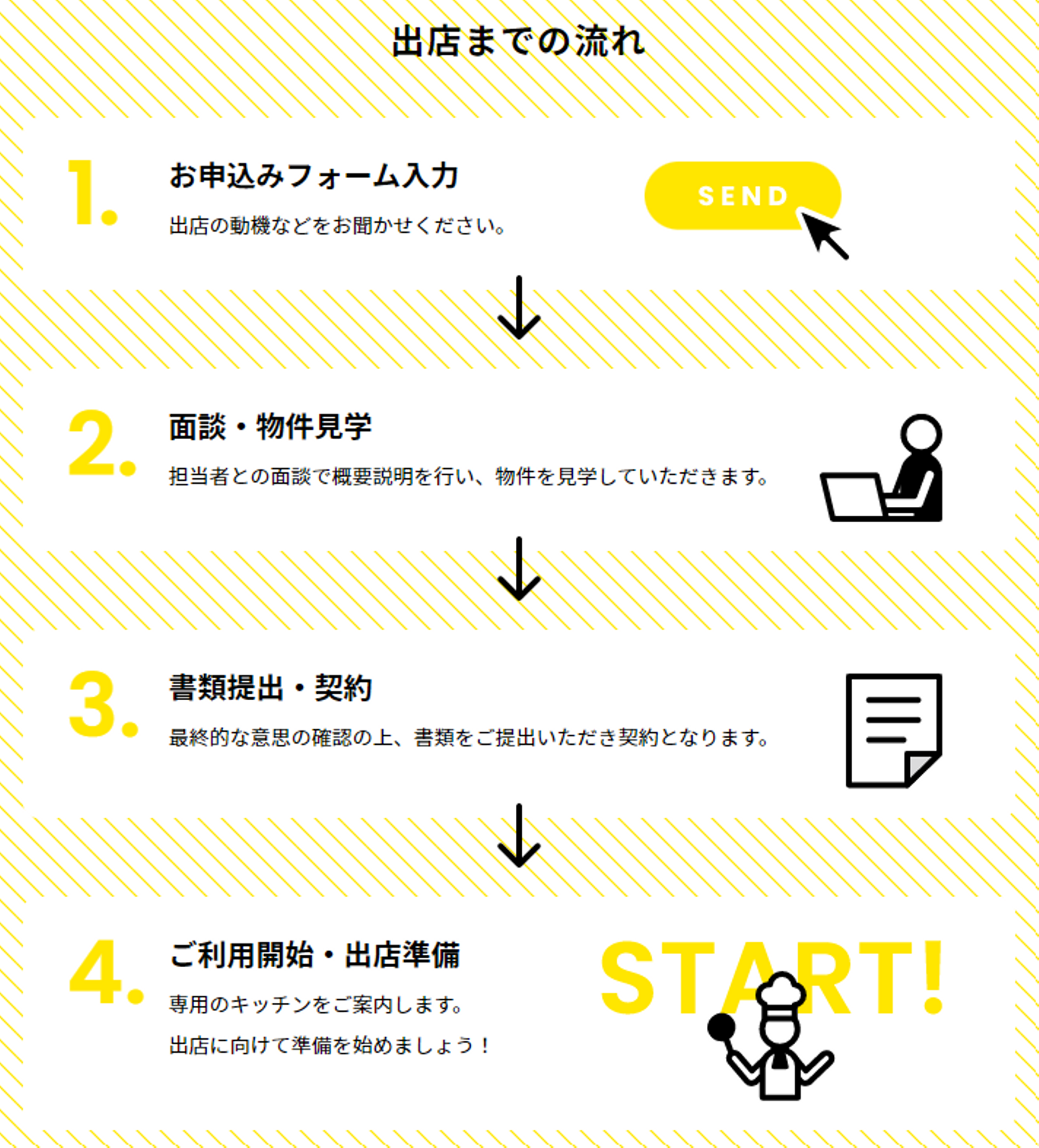 KitchenBASEに興味を持った方が、レストランオーナーとして出店するまでの流れをご紹介します。担当者が迅速に対応しておりますので、お気軽にお問い合わせください。