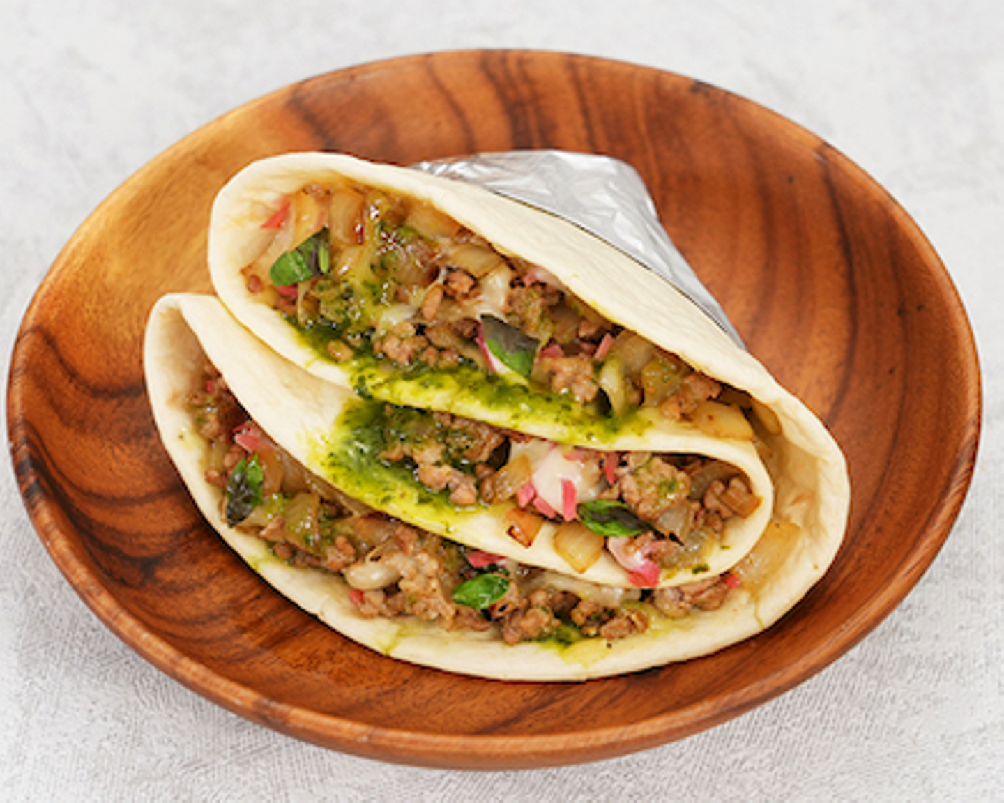 ひき肉をトルティーヤで巻いてバジルソースをかけたイタリアンなタコス。