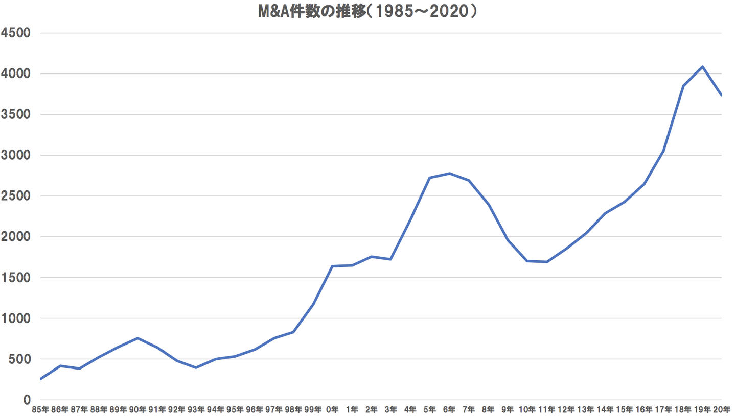 直近の2020(令和2)年には、新型コロナの影響もあり3,730件と前年比8.8%減となっておりますが、2020年後期のM&A成約推移を見ると2021年は過去最高件数を記録するのでは、とも言われています。