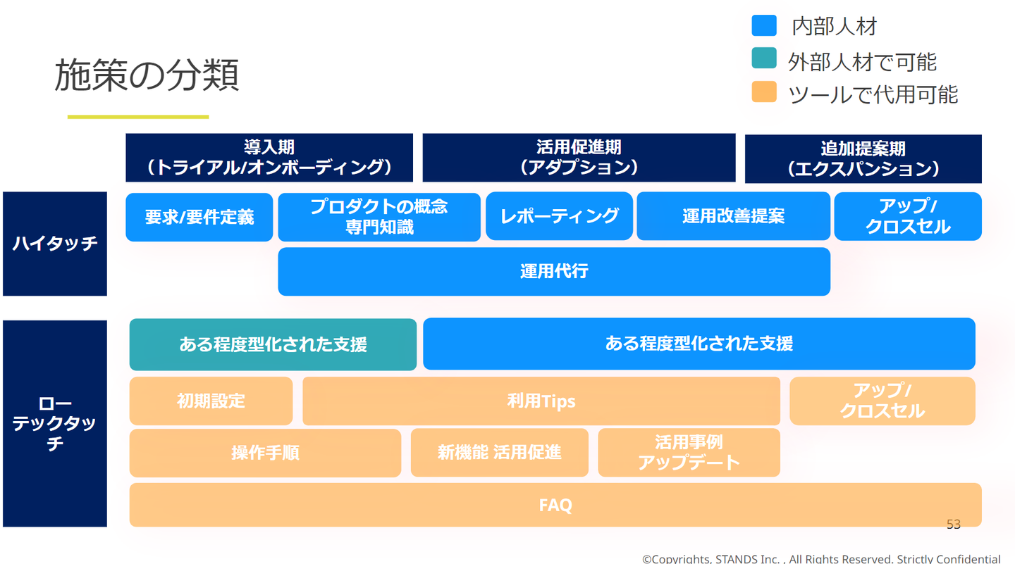 例えば、まずはハイタッチで検証をし、立証できた試みをプロダクト改善や、ロー/ テックタッチ施策へ落とし込むという流れが理想です。