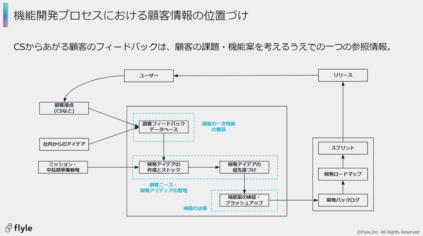 こちらについては、そもそもCSからあがる顧客のフィードバックは、顧客の課題・機能案を考える上での一つの参照情報であるという前提を共有し、解説しました。