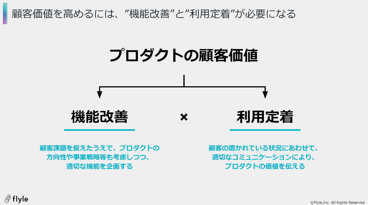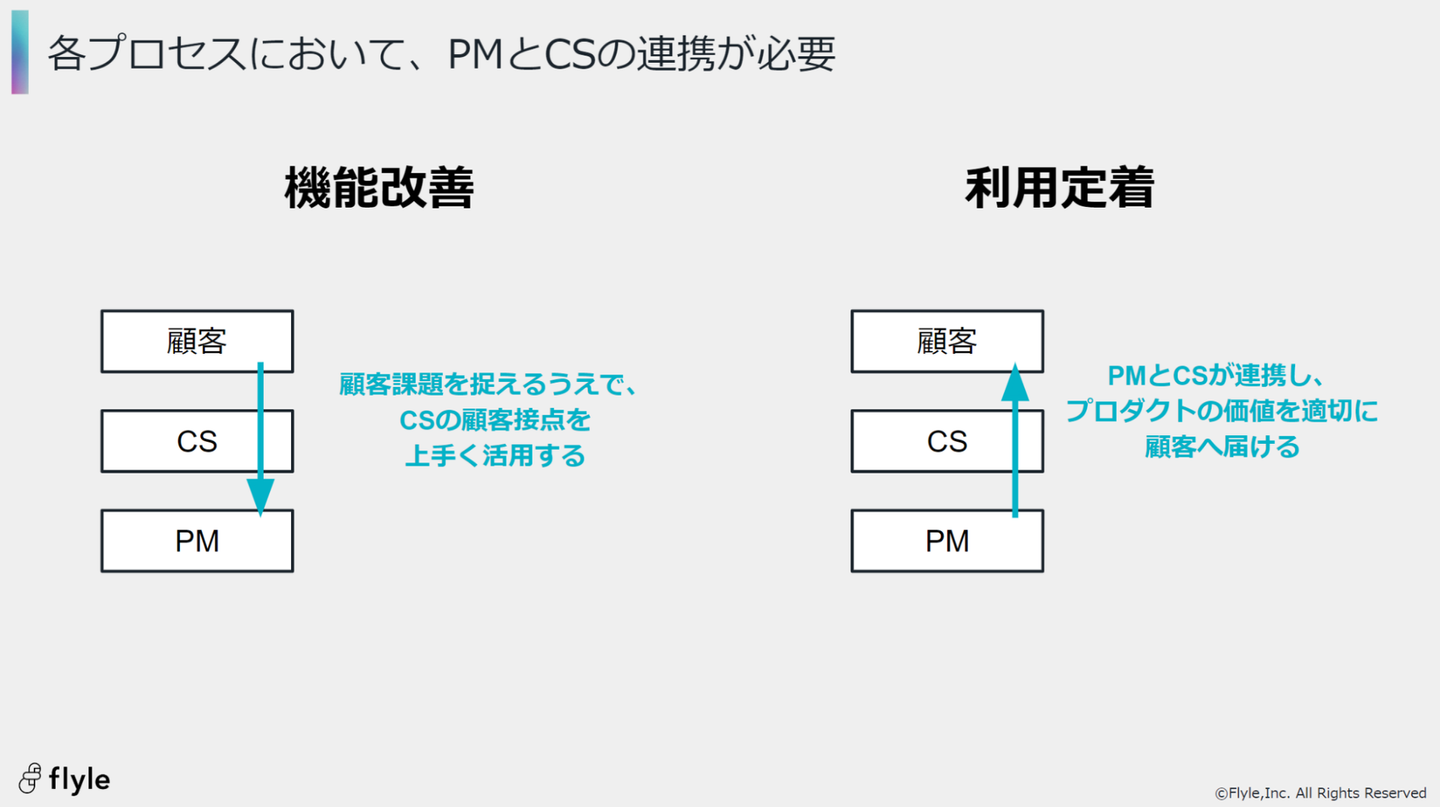 プロダクトを通じて顧客をサクセスに導くためには、顧客の課題を捉えた"機能改善"と、顧客の状況を捉えた適切なコミュニケーションによる"利用定着"の2つが必要です。このプロセスにおいて、顧客接点を持つカスタマーサクセス(CS)と、プロダクトの改善を行うプロダクトマネージャー(PM)の適切な連携が求められることになります。