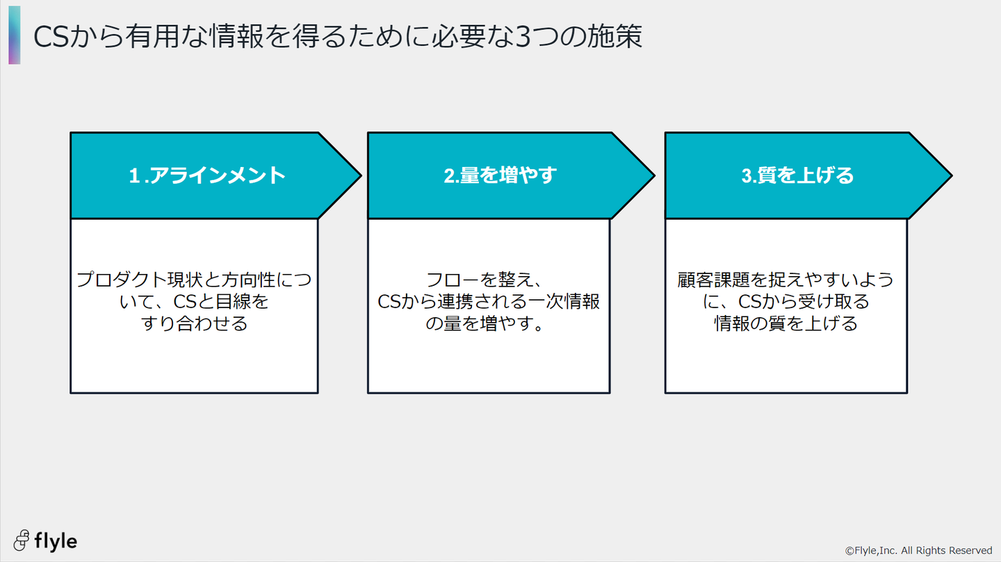 「アラインメント」については、プロダクトの方向性についてPMの発信が必要です。CSサイドは、PMからどのような情報が求められているのか、解像度を上げることで有用な情報を伝えやすくなります。プロダクト開発の方向性、現状、重点テーマなどを連携できるようにしましょう。