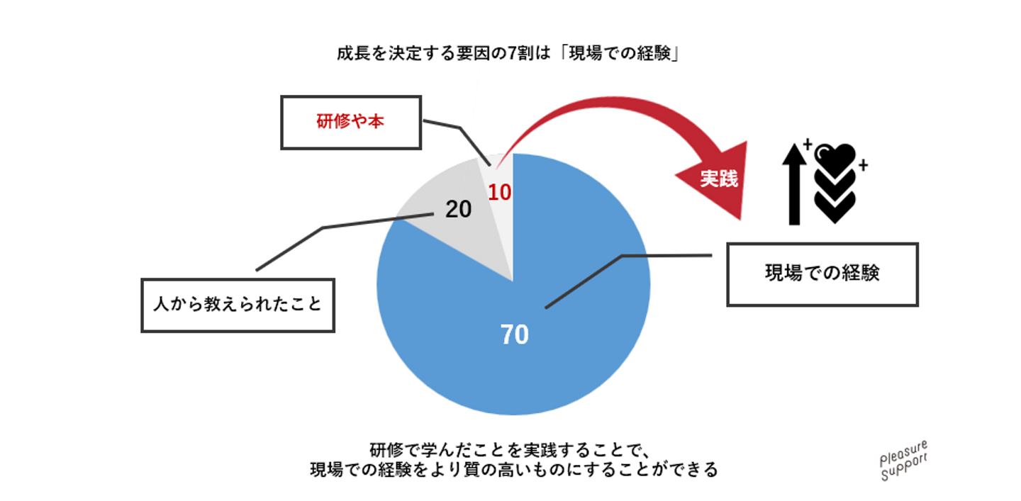 人が成長する要因は「7割」が現場の経験、「2割」が他者からの助言やアドバイス、「1割」が研修や本からの学びといわれています。そんな中で研修、外部での学びを大切だと主張しているのは、そこでしかできないことがあるからです。