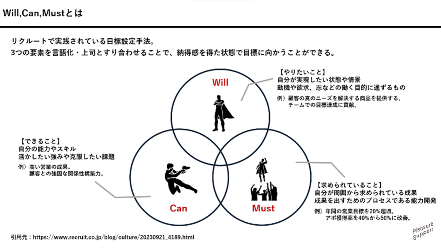 「Will,Can,Must」のフレームワークは、リクルートで実践されている目標設定の手段です。