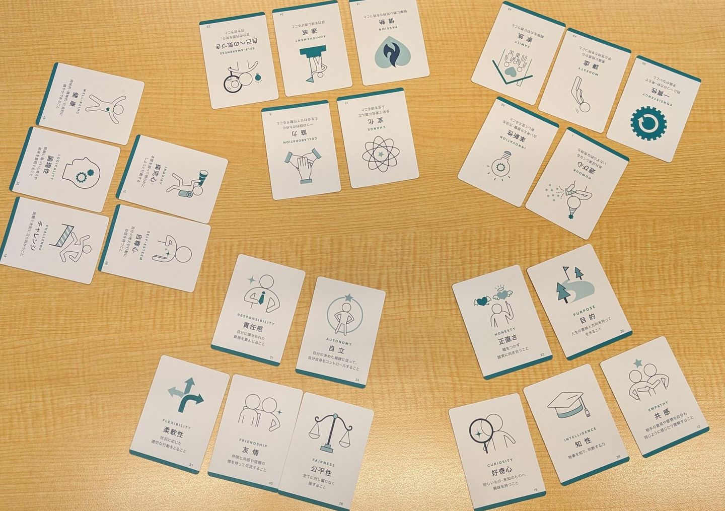 52枚の価値観が書かれたカード。(ルール)各人もち札5枚が配られスタート。①1人1人、山札から1枚引くか、捨てられたカードから1枚引く。②自分の価値観とは違うと感じたもの1枚を捨てる。①②を山札がなくなるまで繰り返し、最終的に残った5つが、テーマに沿った自分にとって大切にしたい価値観ということになる。