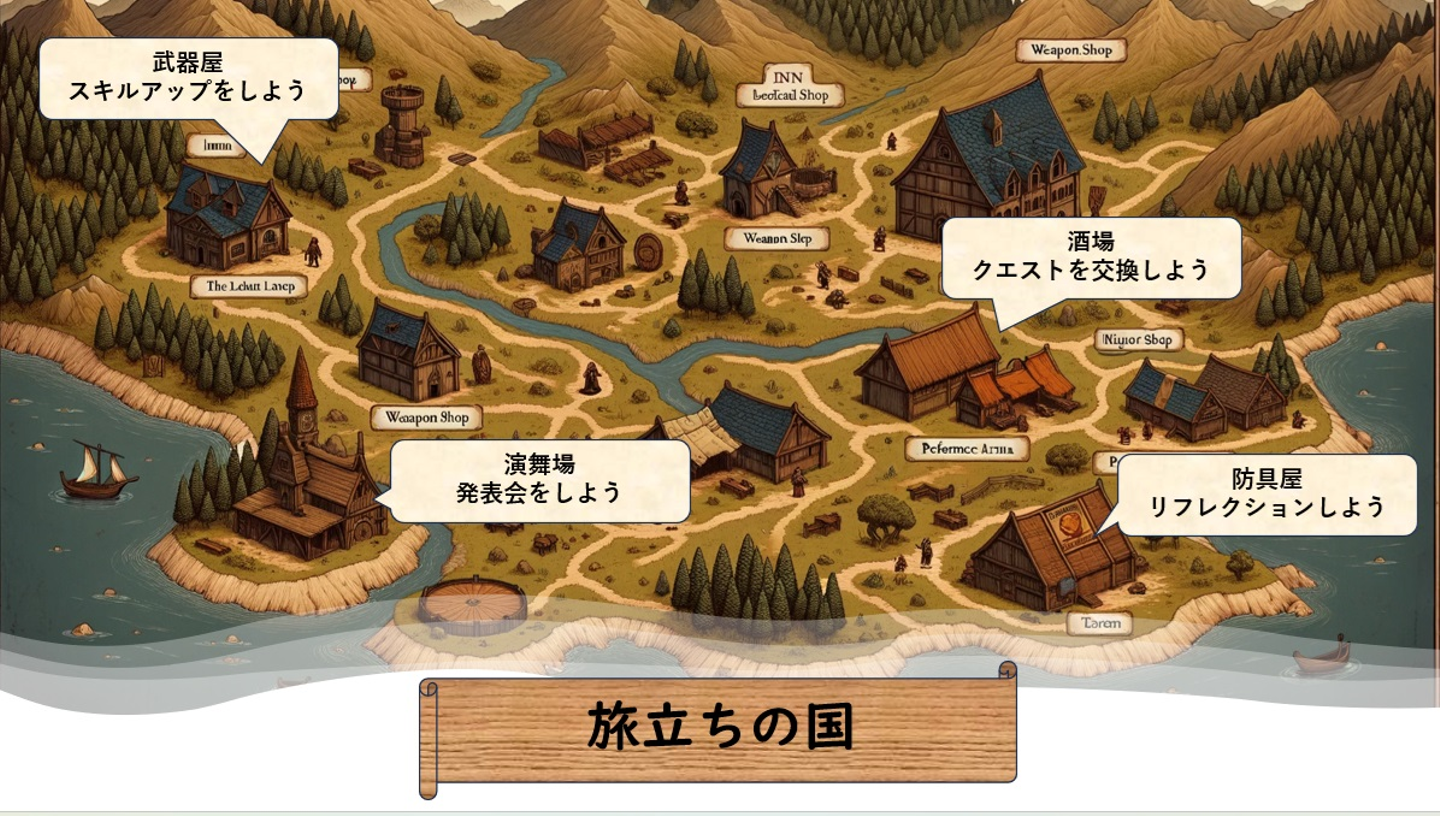 学生の皆様には、まず「旅立ちの国」に入っていただき、スキルアップやリフレクション(内省)を行います。