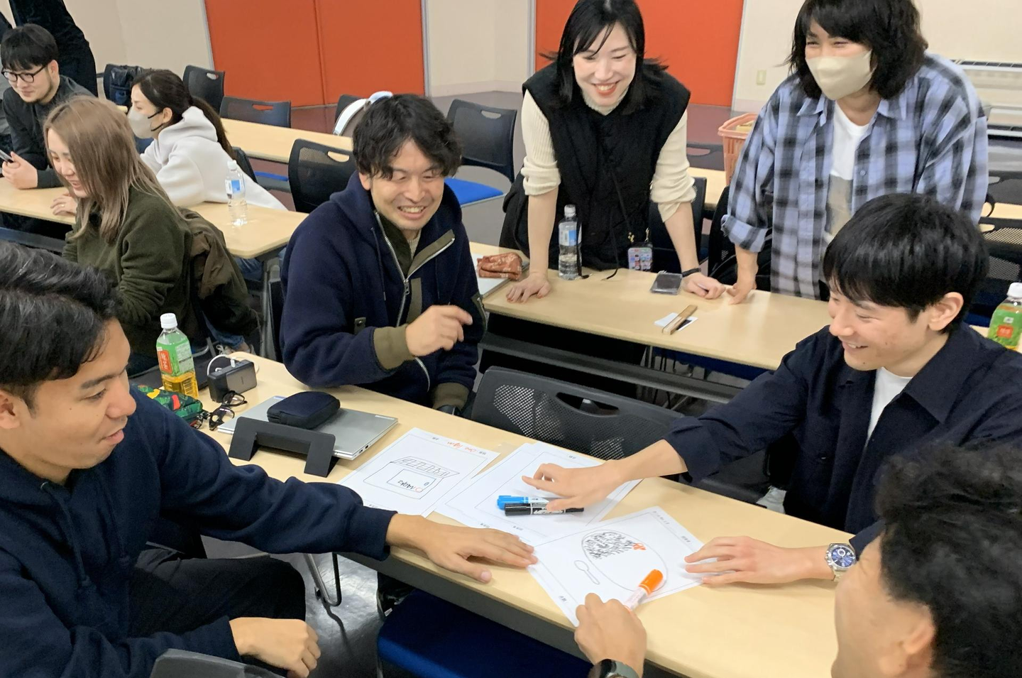 真剣な議論から一転、わきあいあいとした雰囲気で、 1人1本ずつ線を描きながら、チームでお題の絵を完成させ、正解するとポイントが加算されるゲームを行いました。