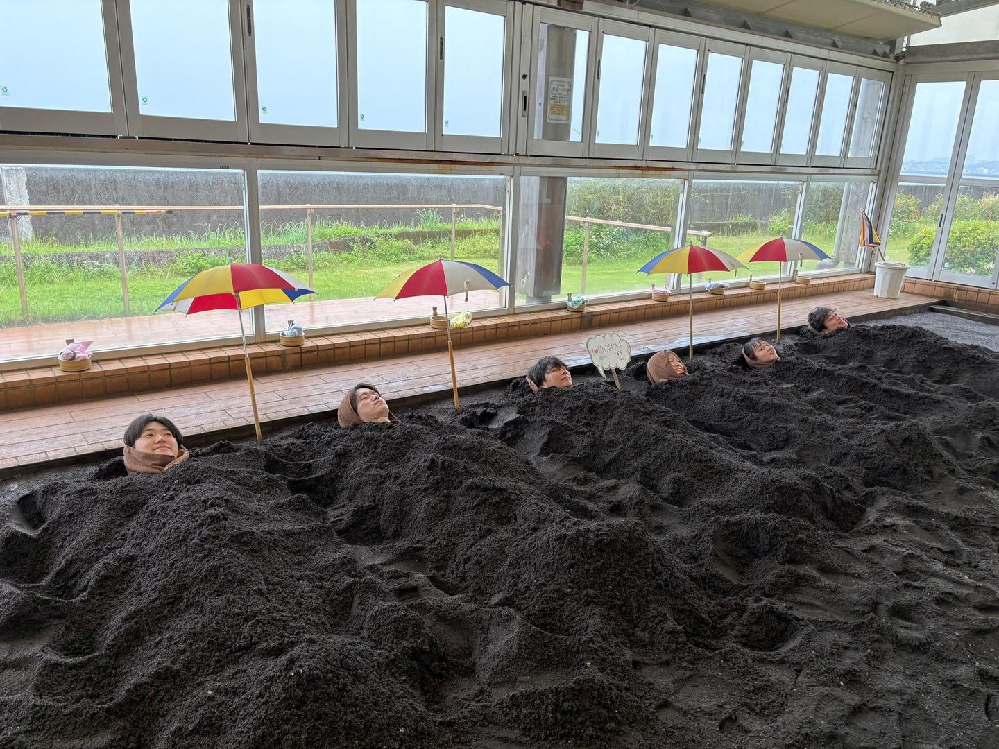 海水浴で砂に埋まる経験をしたことがある方もいらっしゃるのではないかと思います。似たような感覚ではありますが、砂むし温泉は砂が温かい!!温泉の熱によって砂が温められているのです♨️サウナのようだけど暑すぎず心地良い、不思議な感覚でした!砂の重みも相まって、お布団に入っているような(笑)