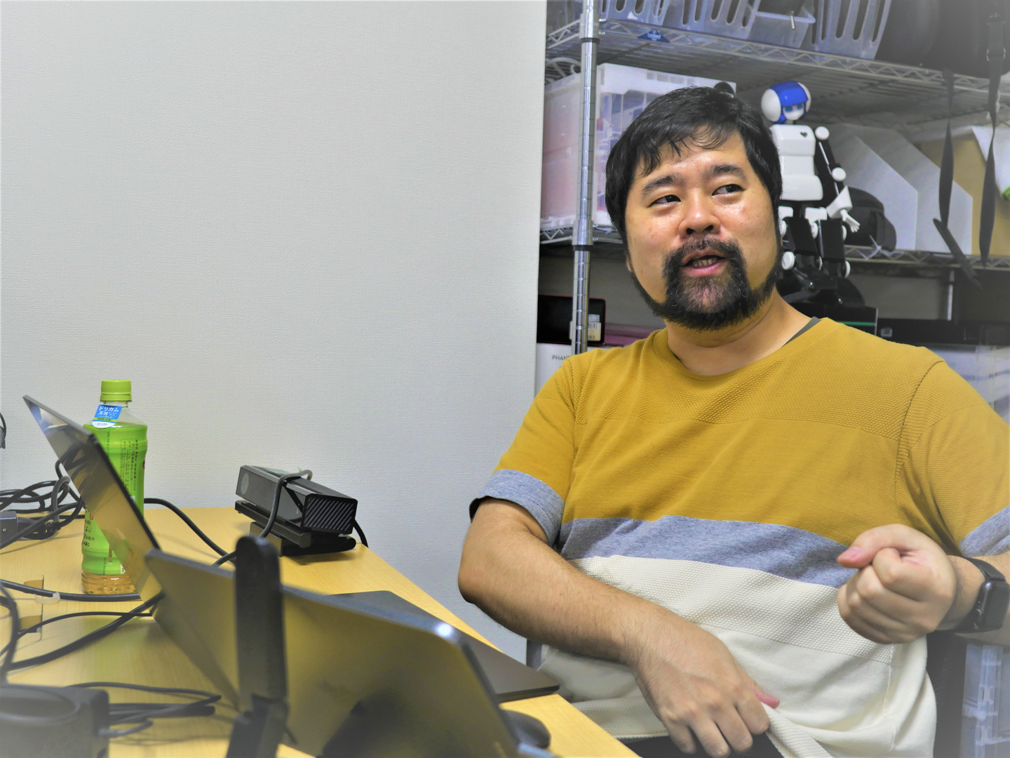 (写真1:メンバーと談話する様子。机の端にある、四角いデバイスはMicrosoft Kinect。)
