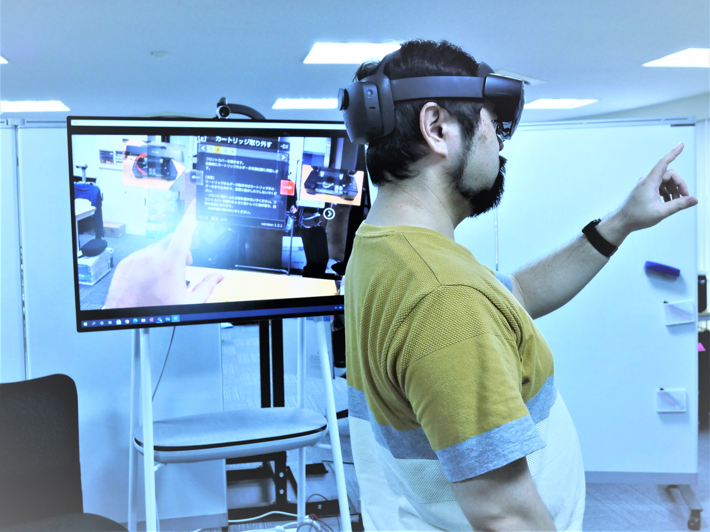 (写真2:HoloLensを操作中。白木から見えている景色がモニターに映し出されています。)