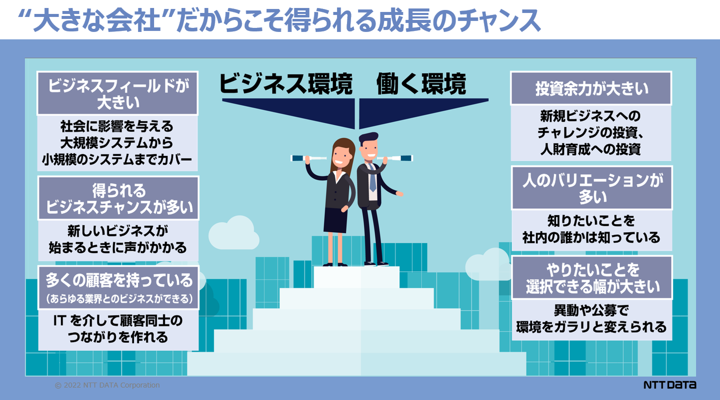 私たちNTTデータは、大変大きな会社です。「大きな会社」には、大きな会社だからこそ得られるチャンスがたくさんあります。