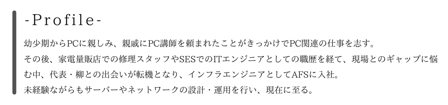 SESの会社で働いた経験があり、自他ともに認めるPC好きの彼ですが、実はAFSに入社するまでインフラエンジニアという職業を知らなかったと言います。