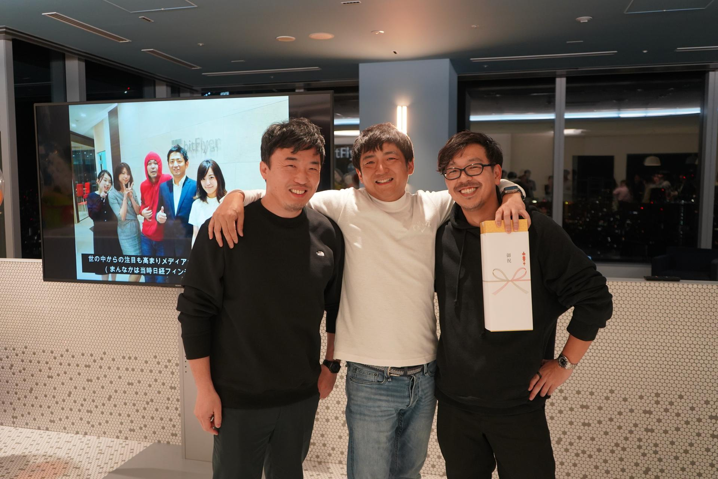 さらには、bF卒業生を代表して、現在(株)Decentier代表取締役を務める小畑さんからお祝いのスピーチ。bF卒業生は起業する方がとても多いのです。加納さんの仕事の仕方を近くで見て、経営を学び、自分自身でもいつか起業したいと思う社員のインキュベーション施設にbitFlyerがなっているのかもしれません。小畑さんと一緒に起業されたDecentier取締役の市薗さんとのハイポーズ。