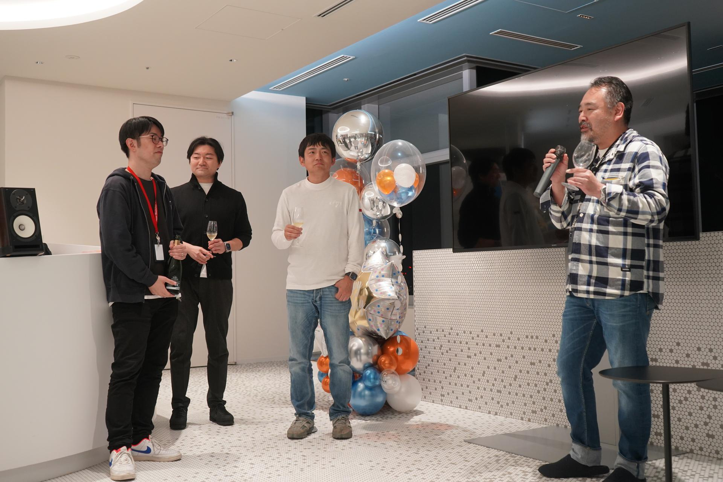 乾杯に使用したシャンパンは2014年の創業年ヴィンテージを用意しました。弁護士でありソムリエ資格を持つ(日本だけでなく海外のソムリエ資格も保有する)佐々木さんのセレクトです!来賓の方々、集まった社員と共に盛大に乾杯!