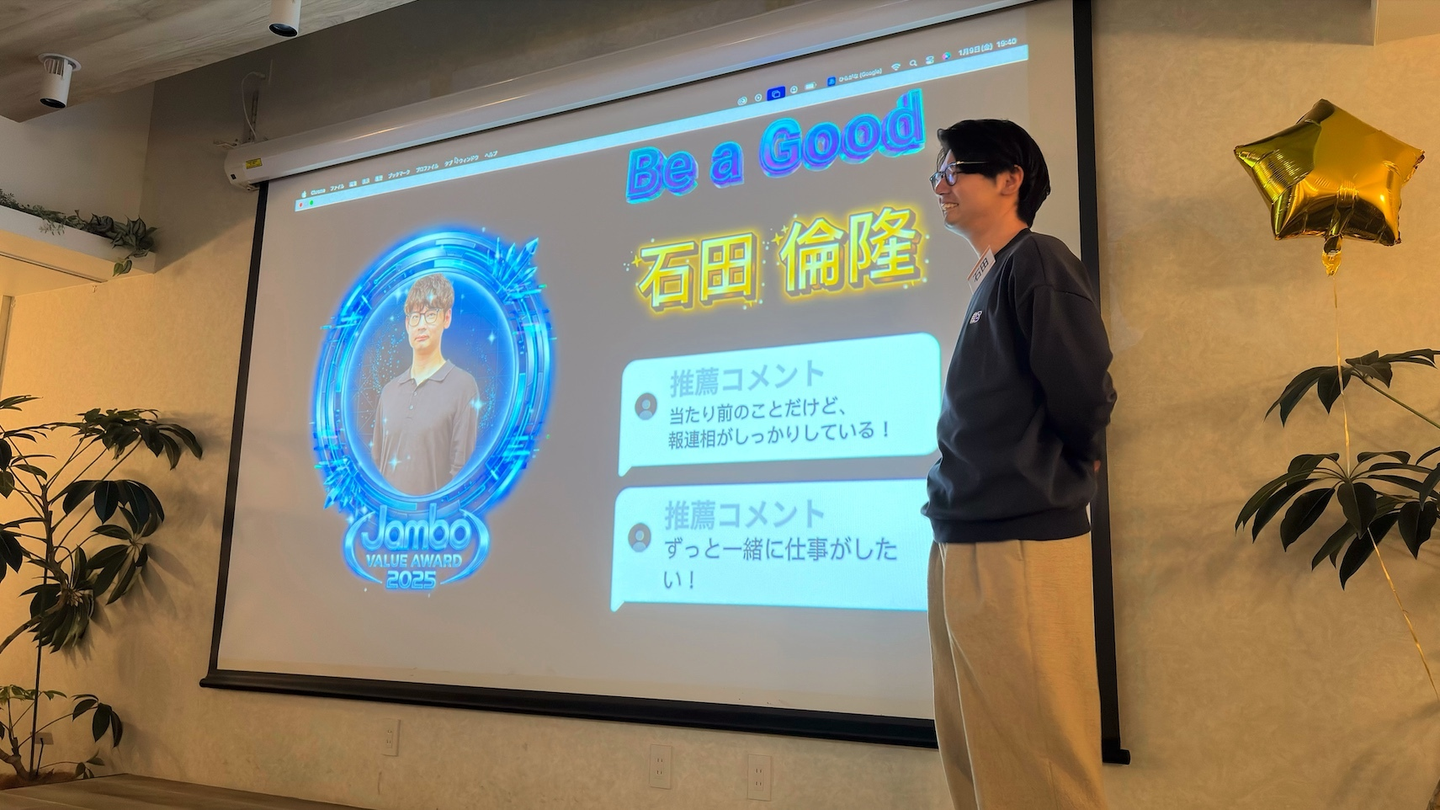 今回は先日のJambo Value Award(社内表彰)にてBe a Good賞にノミネートされた石田さん(Flutterエンジニア:チームリーダー)への受賞者インタビューです✨️