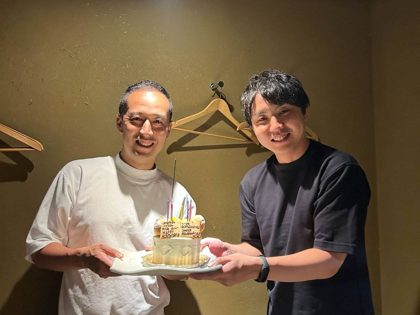 研修の最後は、熊本市内でDoooxメンバーでのお疲れ様会!誕生日が同じ、代表久保寺と執行役員末廣に、新卒メンバーからサプライズケーキのプレゼント!Doooxらしい、温かい雰囲気で研修を締めくくりました。
