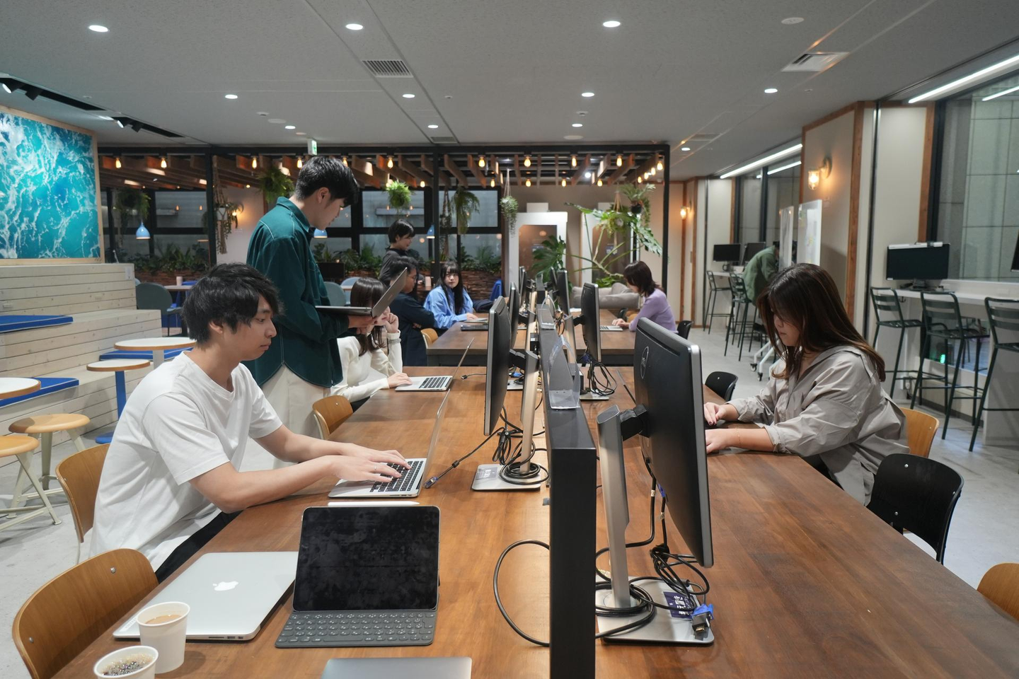 LULLの社員はオフィスに併設された、シェアオフィスが使い放題です!リモートワークのプロジェクトの作業スペースとして使用したり、業務後に学習のために使うことも可能です!
