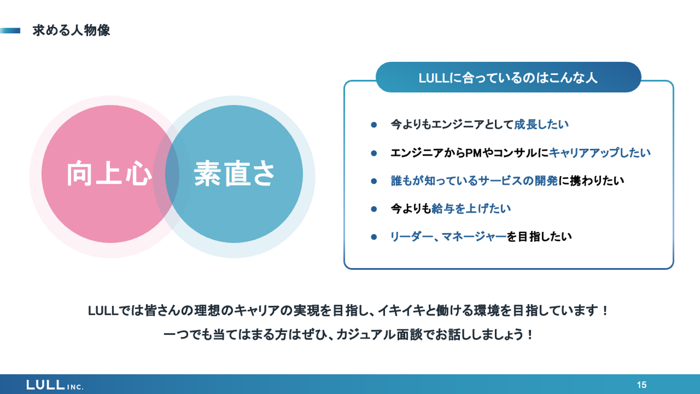 LULLでは皆さんが理想のキャリアの実現を目指し、イキイキと働ける環境を目指しています!一つでも当てはまる方はぜひ、カジュアル面談でお話ししましょう!