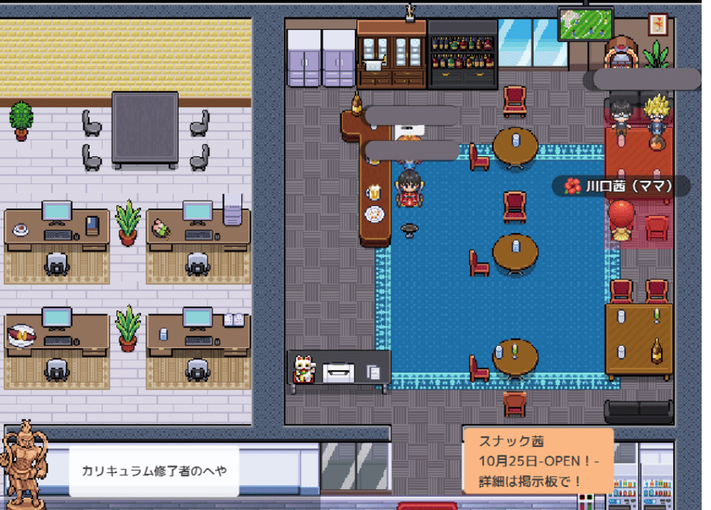 カリキュラムを修了した方のみが入れる特別な部屋です。この部屋は、カリキュラムを全て終えた人たちが集まり、次のステップについて話し合ったり、情報を共有したりする場となっています。受講中の方にとっては、一つの目標でもあり、仲間たちとともに達成感を味わえる空間です!