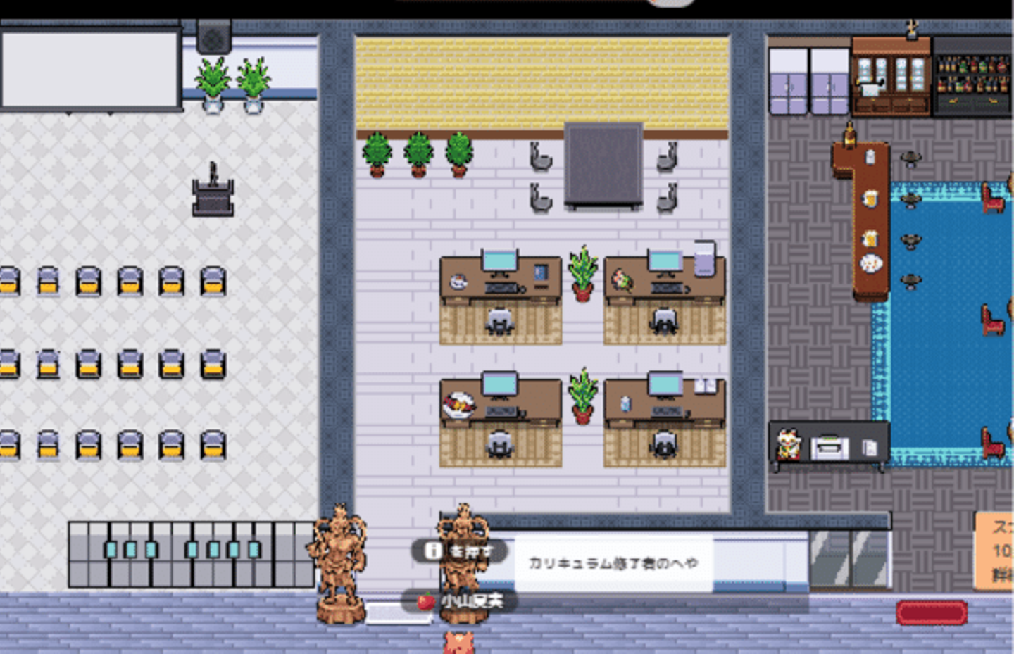 まずバーチャルオフィスにログインすると、アバターのメイキングが可能で、自分の個性やスタイルを表現したキャラクターを作成できます。このアバターで仮想空間を歩き、会話や学習ができるため、まるでゲームのような感覚で楽しみながら学べます。