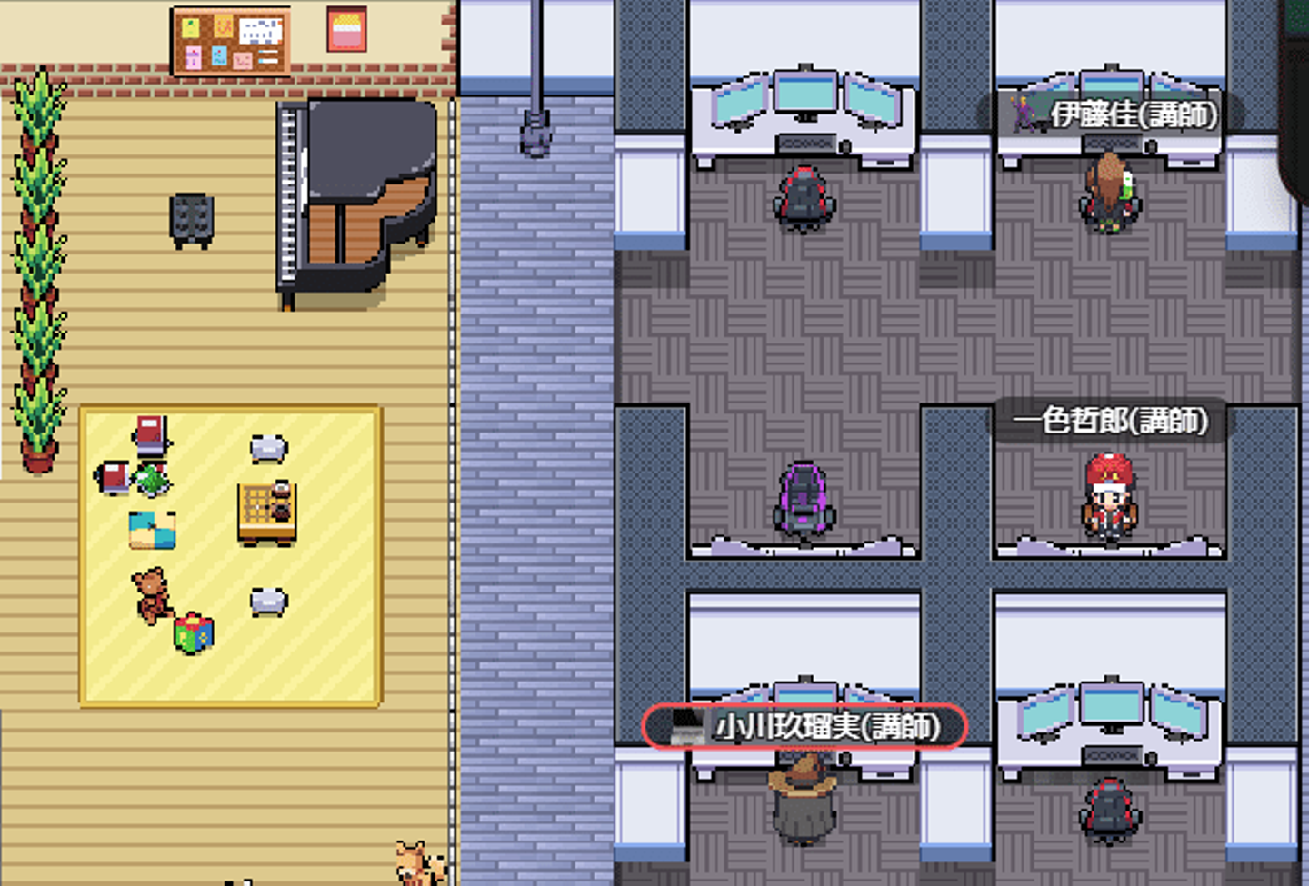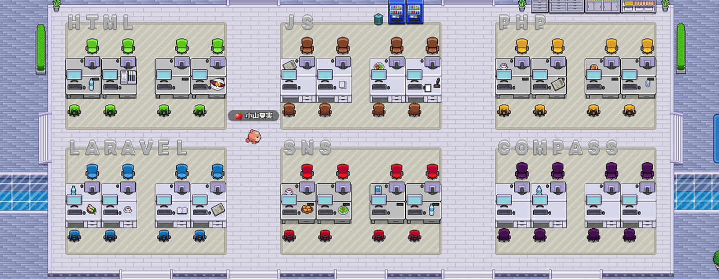 LULLでは、MetaLifeというオンラインコミュニケーションツールを活用してバーチャルオフィスを運営しています。バーチャルオフィスではドットでかわいいデザインのキャラクターを作ってオフィス内を歩き回ることができます!