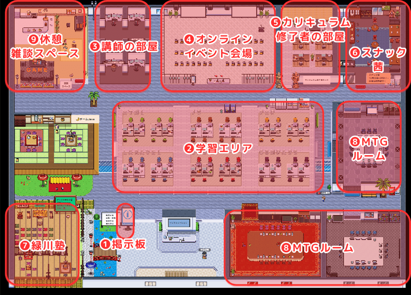 こちらはバーチャルオフィスの全体像です!色々なエリアがありますね~