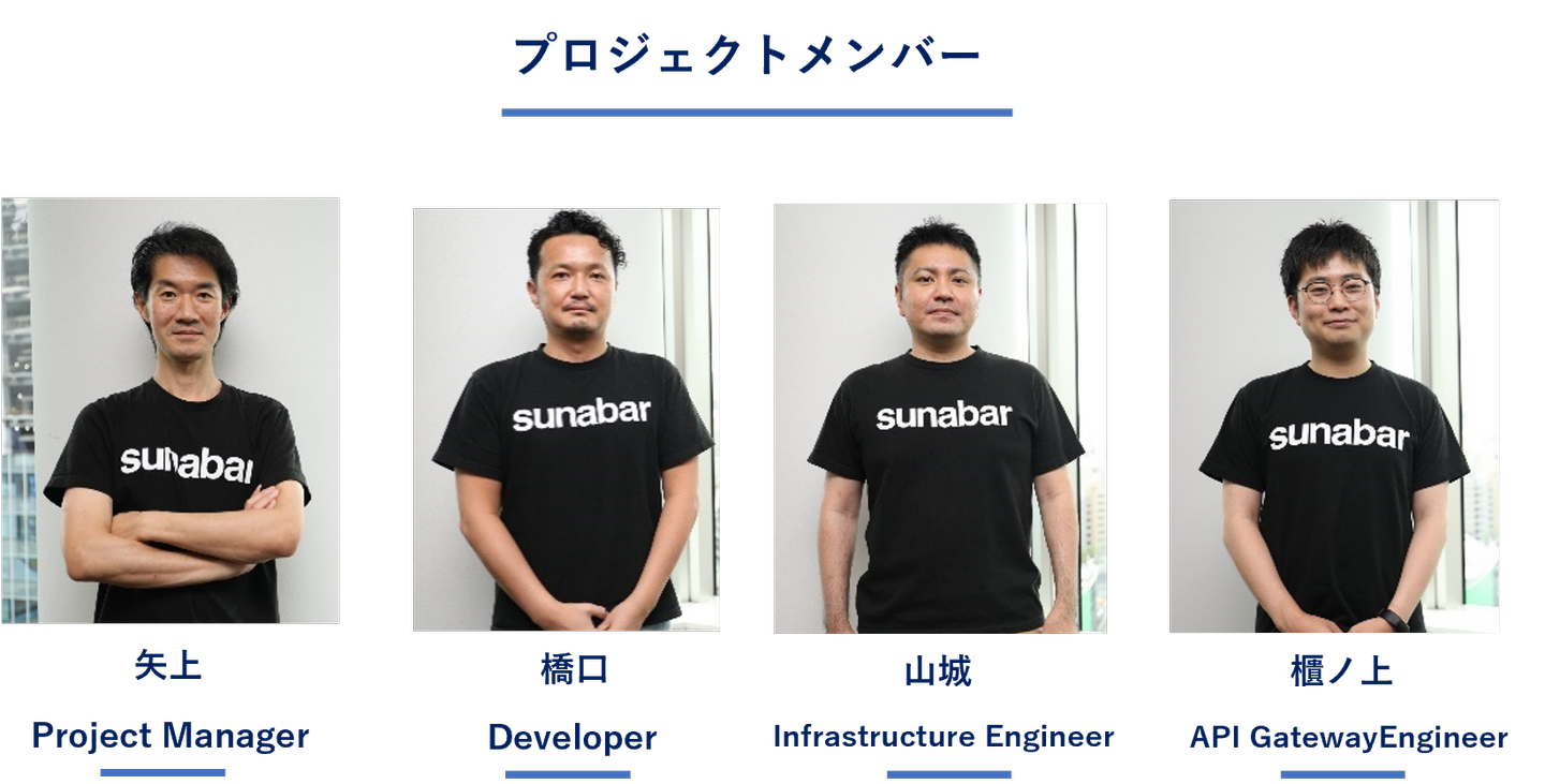 今回のsunabarの立ち上げメンバーは、エンジニアの社内公募で募集しました。その中で、私は、プロジェクトマネージャーとして、プロジェクト全体の進行・管理を担当しました。