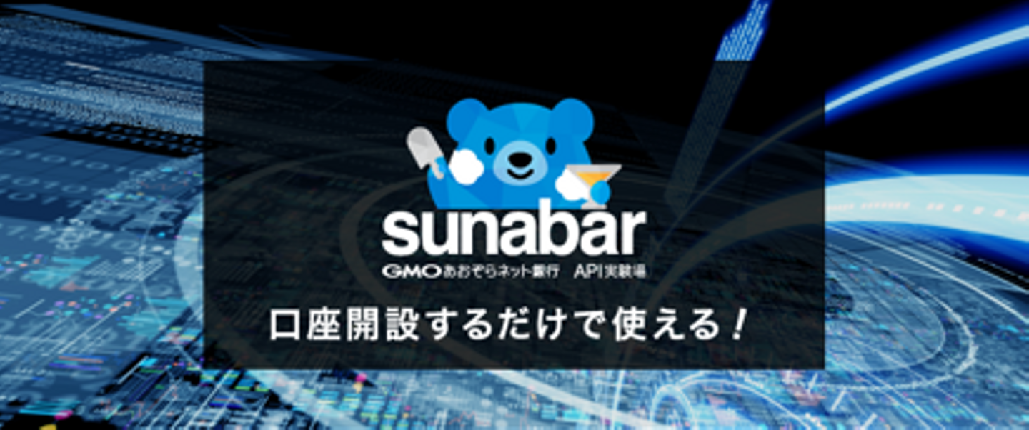 「sunabar -GMOあおぞらネット銀行API実験場-(以下、「sunabar」)」はGMOあおぞらネット銀行のAPI実験場で、外部から口座情報を取得や、振込処理を可能にする銀行API機能を自由に試せるサンドボックス環境(sandbox/通常ユーザが利用するシステムに影響がでない、独立した環境)です。