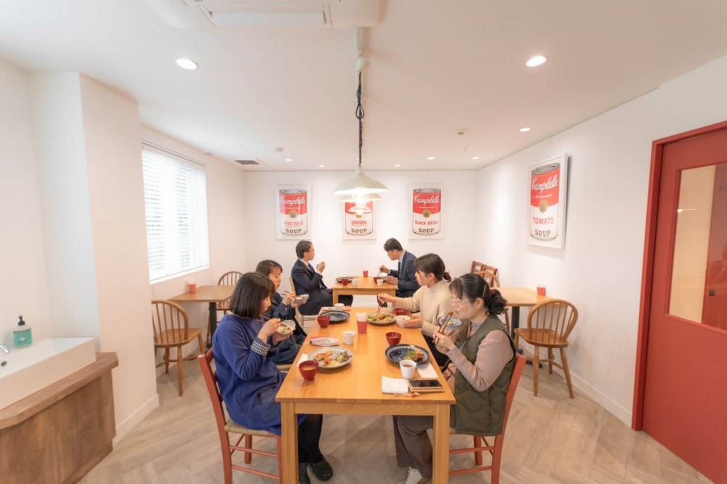 横浜本社にある「はたけのキッチン」は、部署の垣根を越えた交流の場になっています。お弁当派も食堂に集まり、部署関係なくわいわいと食卓を囲む時間は、社員からも「会社かな?と思うくらい楽しい」と好評を得ています。