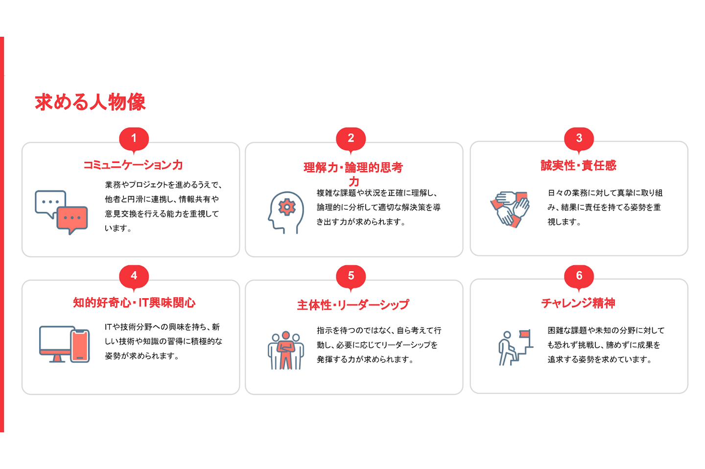 IIJエンジニアリングでは、技術力や経験の有無以上に、「どんな姿勢で仕事に向き合えるか」を大切にしています。新卒採用において掲げている求める人物像は、以下の6つの要素です。
