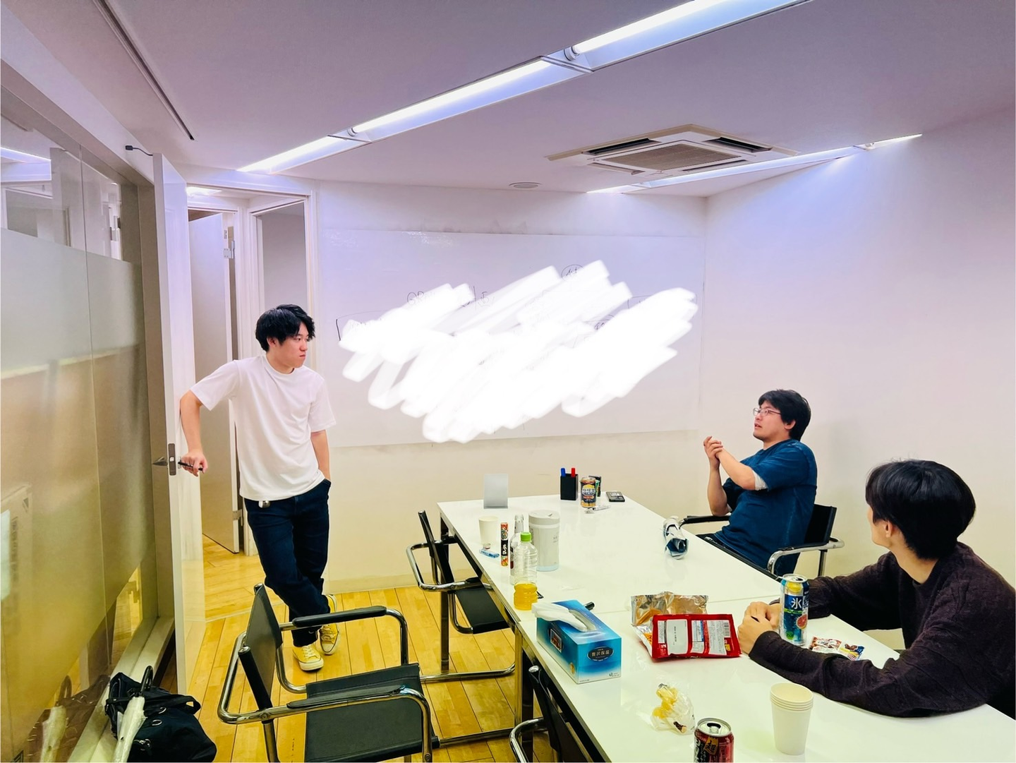 お互いの目標や夢について話しをしたり、大会議室のホワイトボードを使用してお互いの知識や考えを交換しています!