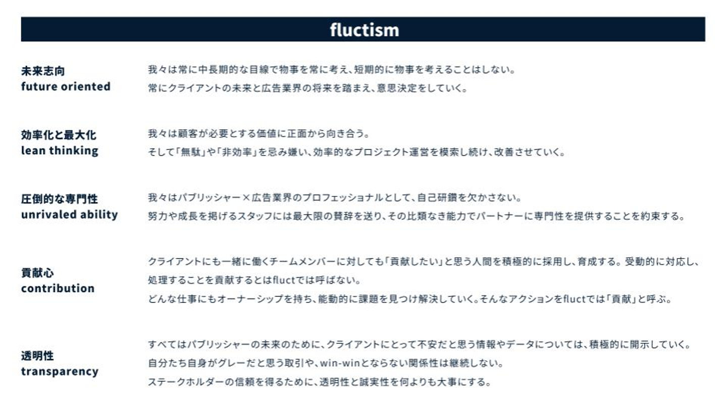 (※1)fluctのバリュー…未来志向・効率化と最大化・圧倒的な専門性・貢献心・透明性の5つのこと。詳しくはこちらから。