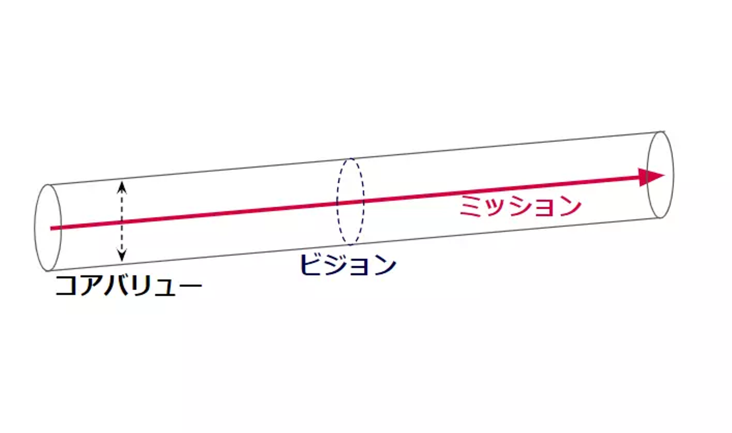 トンネルは枠(=コアバリュー )と軸(=ミッション)から成り立っています。そしてある時点でのトンネルの断面がビジョンです。その時のありたい姿ですね。